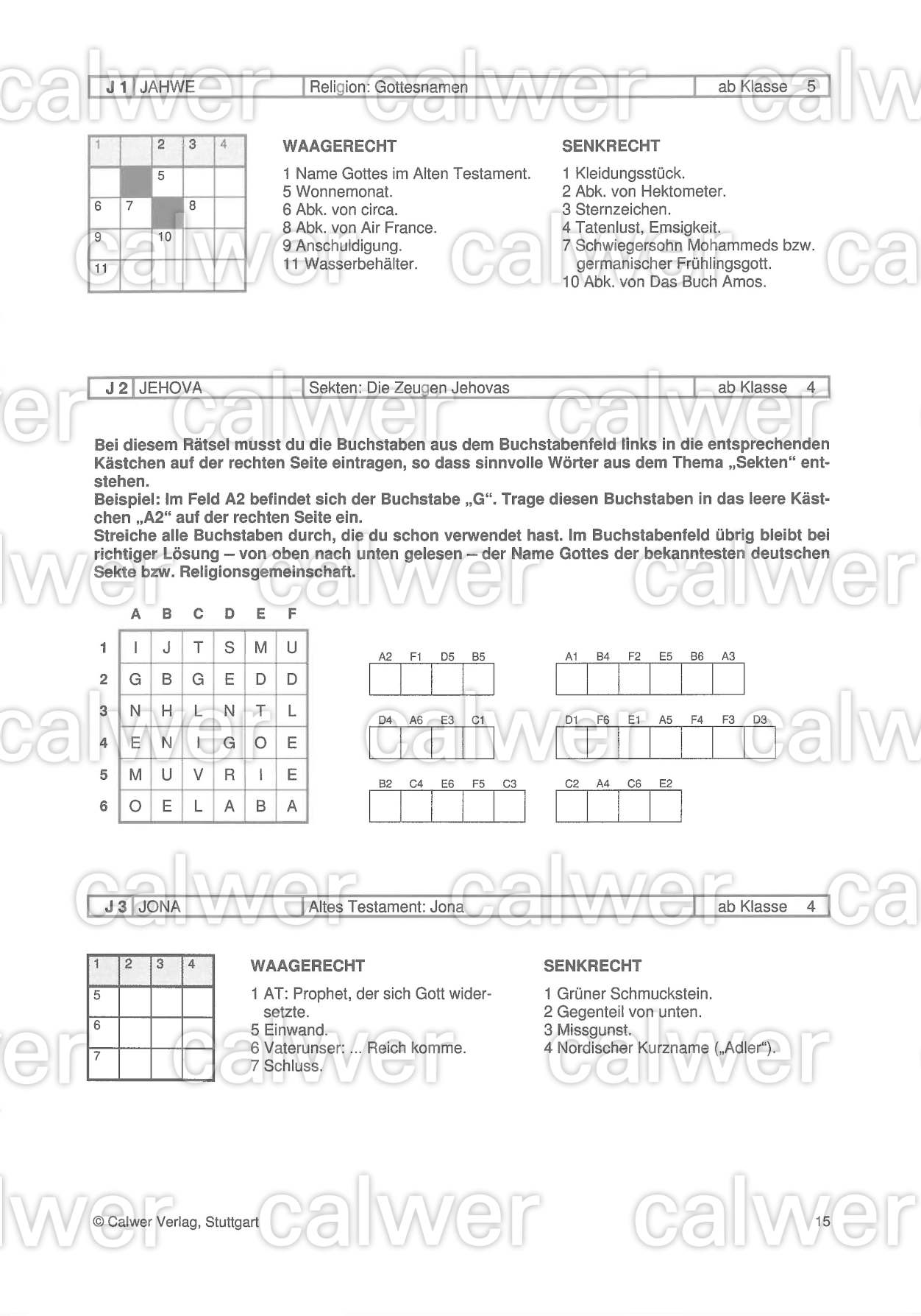 Die Rätsel stammen aus den Bereichen Religionspädagogik und Gemeindeleben. Sie sind alphabetisch nach den jeweiligen Lösungsworten sortiert. Jedes der 100 Minirätsel hat eine eigene Titelzeile, die das Lösungswort sowie den thematischen Zusammenhang, in dem dieses Rätsel eingesetzt werden kann, enthält.