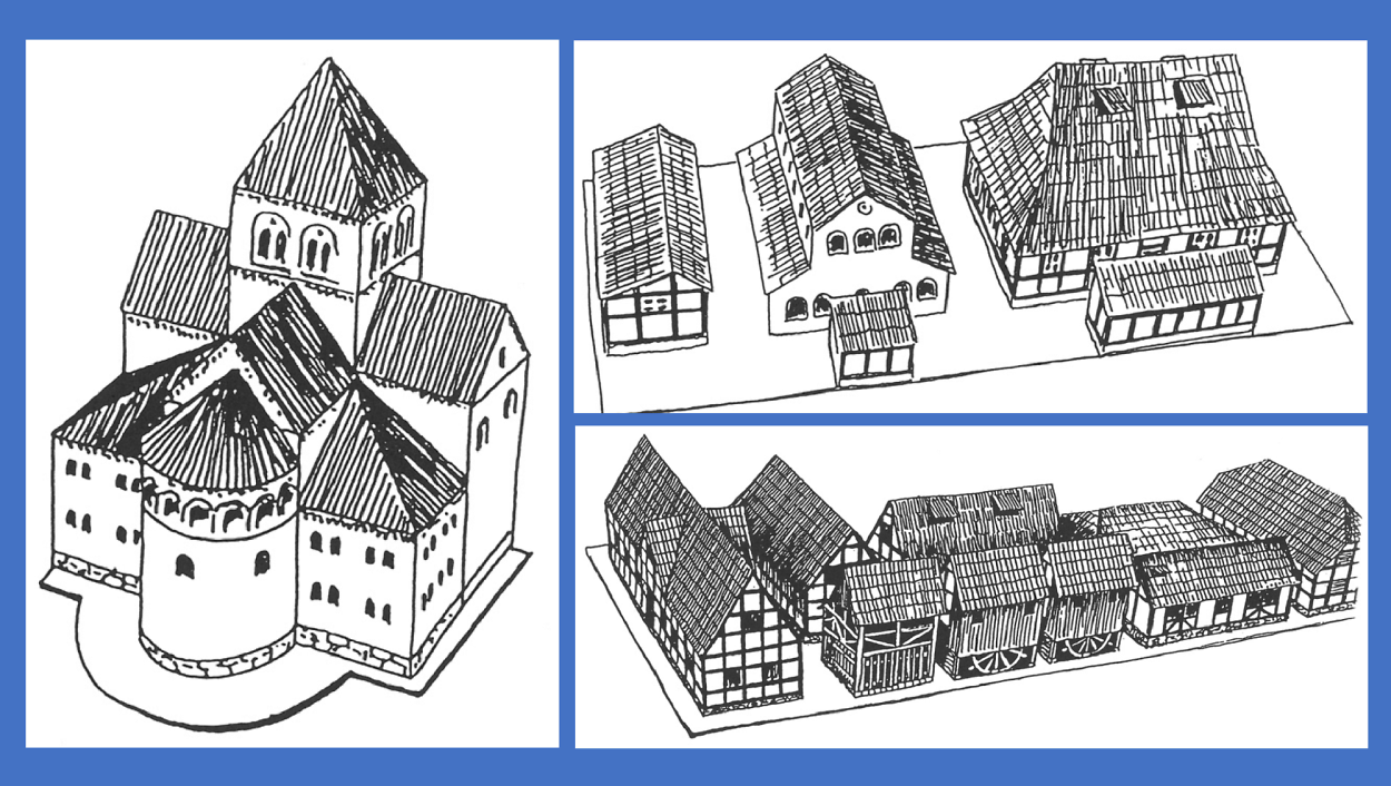 Das vorliegende Modell einer mittelalterlichen Klosteranlage wird auf dem unveränderten St. Gallener Idealplan aus dem 9. Jahrhundert aufgebaut. Die Zeichnung der Bauteile wurde der einfachen, skizzenhaften Darstellungsweise dieses Planes angegelichen, sodass auch Ungenauigkeiten beim Falzen und Kleben einzelner Gebäude nicht störend auffallen werden. Die Gebäude werden in der Bauweise des 9./10. Jahrhunderts dargestellt in Anlehnung an Rekonstruktionen, die Historiker zum St. Gallener Klosterplan anfertigten. Die Größe der aufgebauten Anlage beträgt 42x59 cm.