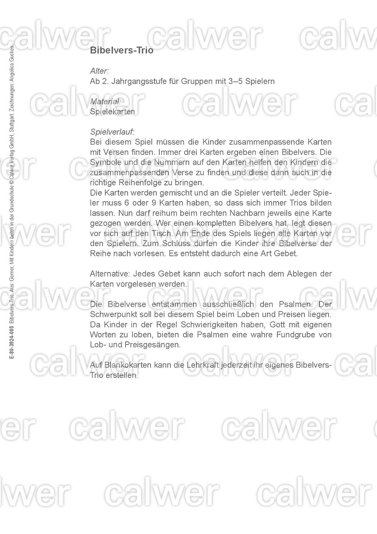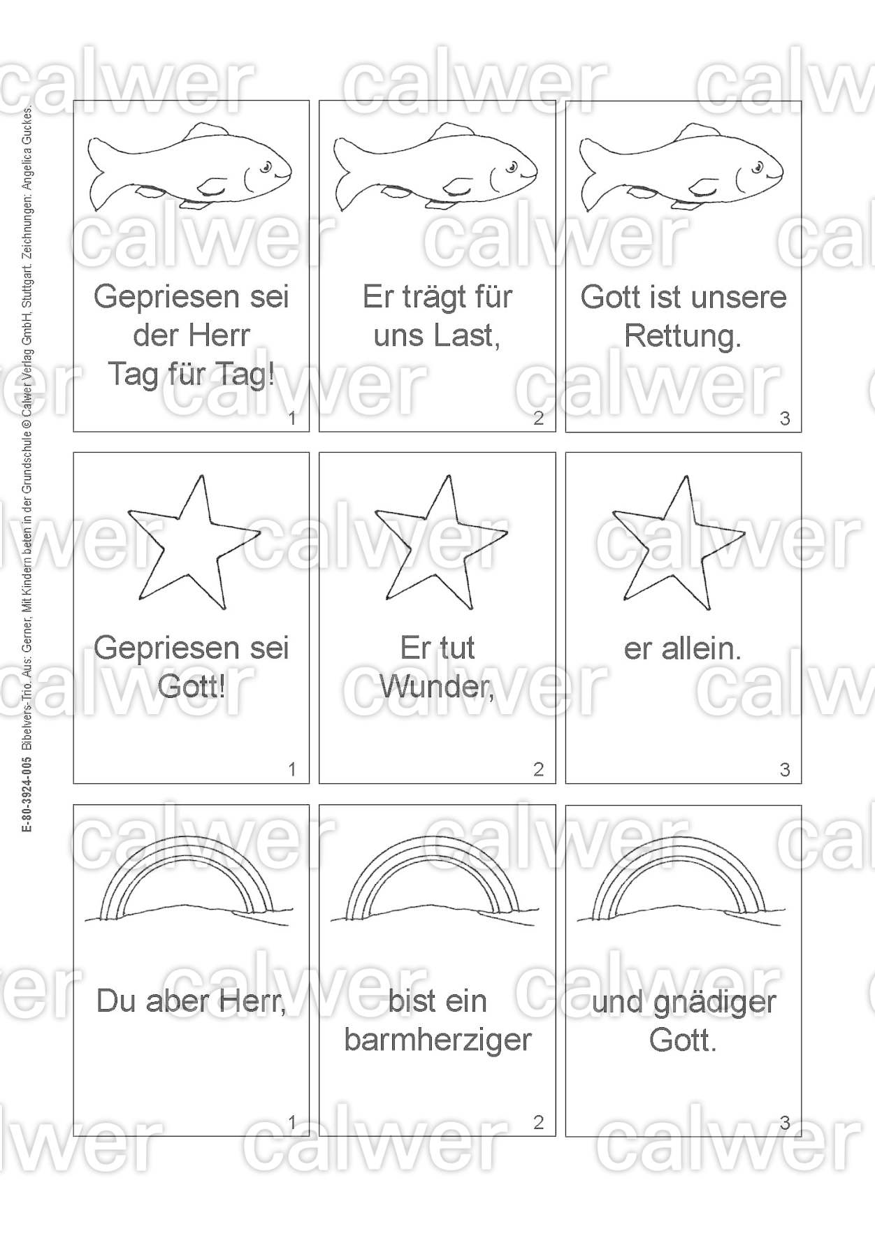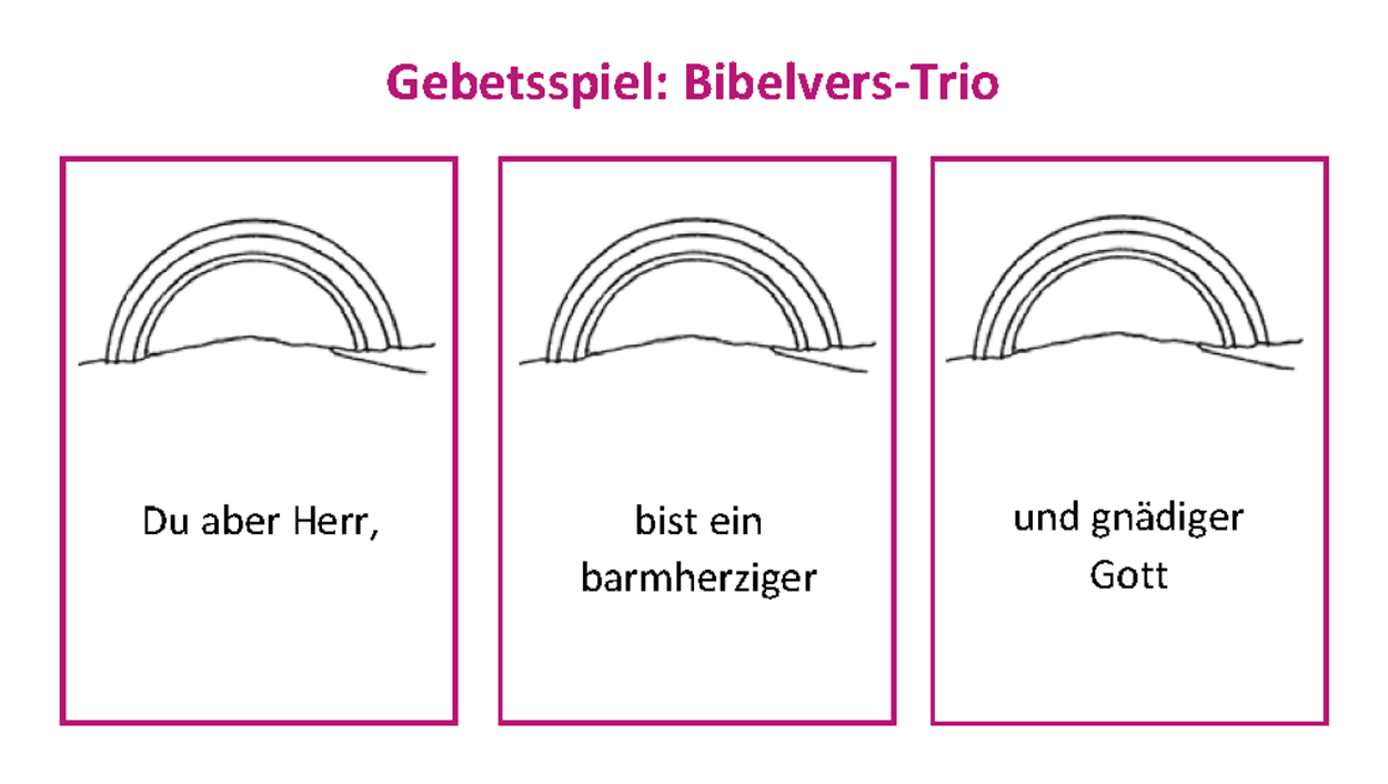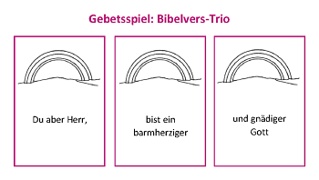 Bei diesem Gebetsspiel müssen die Kinder zusammenpassende Karten mit Versen finden. Immer drei Karten ergeben einen Bibelvers. Kinder im Grundschulalter werden so spielerisch an das Beten herangeführt.