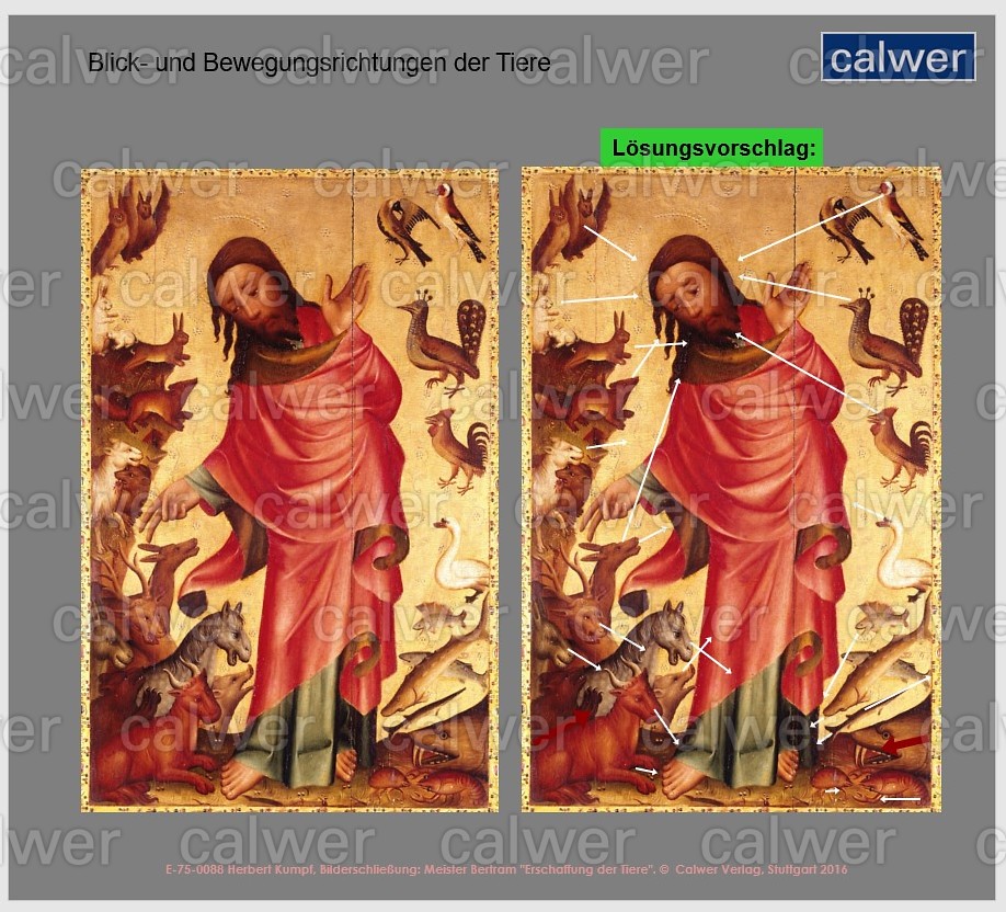 Mit einer Bilderschließung kann man sehr gut die mit kleinen Varianten in allen neuen Bildungsplänen rezipierten prozessbezogenen Kompetenzen einüben und vertiefen. Die umfangreiche Unterrichtseinheit der Bilderschließung zum bekannten Bild „Erschaffung der Tiere“ eignet sich hervorragend zur Bearbeitung des Themas Schöpfung.