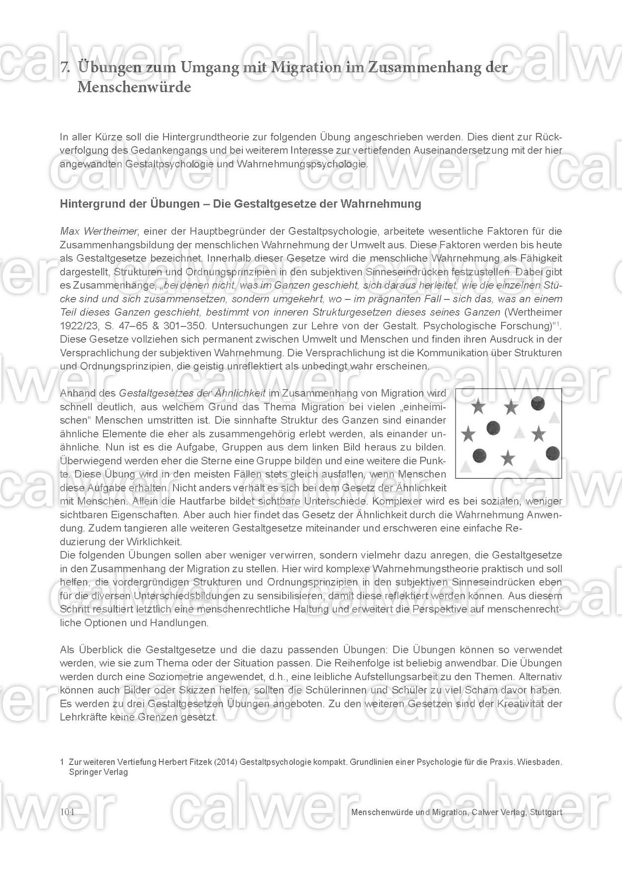 Zudem finden sich praktische Übungen zum Umgang mit Migration im Zusammenhang der Menschenwürde (Gestaltgesetze der Wahrnehmung / Gestaltgesetze im Zusammenhang von Migration und Selbstreflexion: Gesetz der Nähe, Gesetz der guten Gestalt, Gesetz der guten Fortsetzung, Gesetz der gemeinsamen Region, Gesetz der Gleichzeitigkeit, Gesetz der Verbundenheit, Gesetz der Ähnlichkeit/Zusammengehörigkeit, Gesetz der Geschlossenheit, Gesetz des gemeinsamen Schicksals).